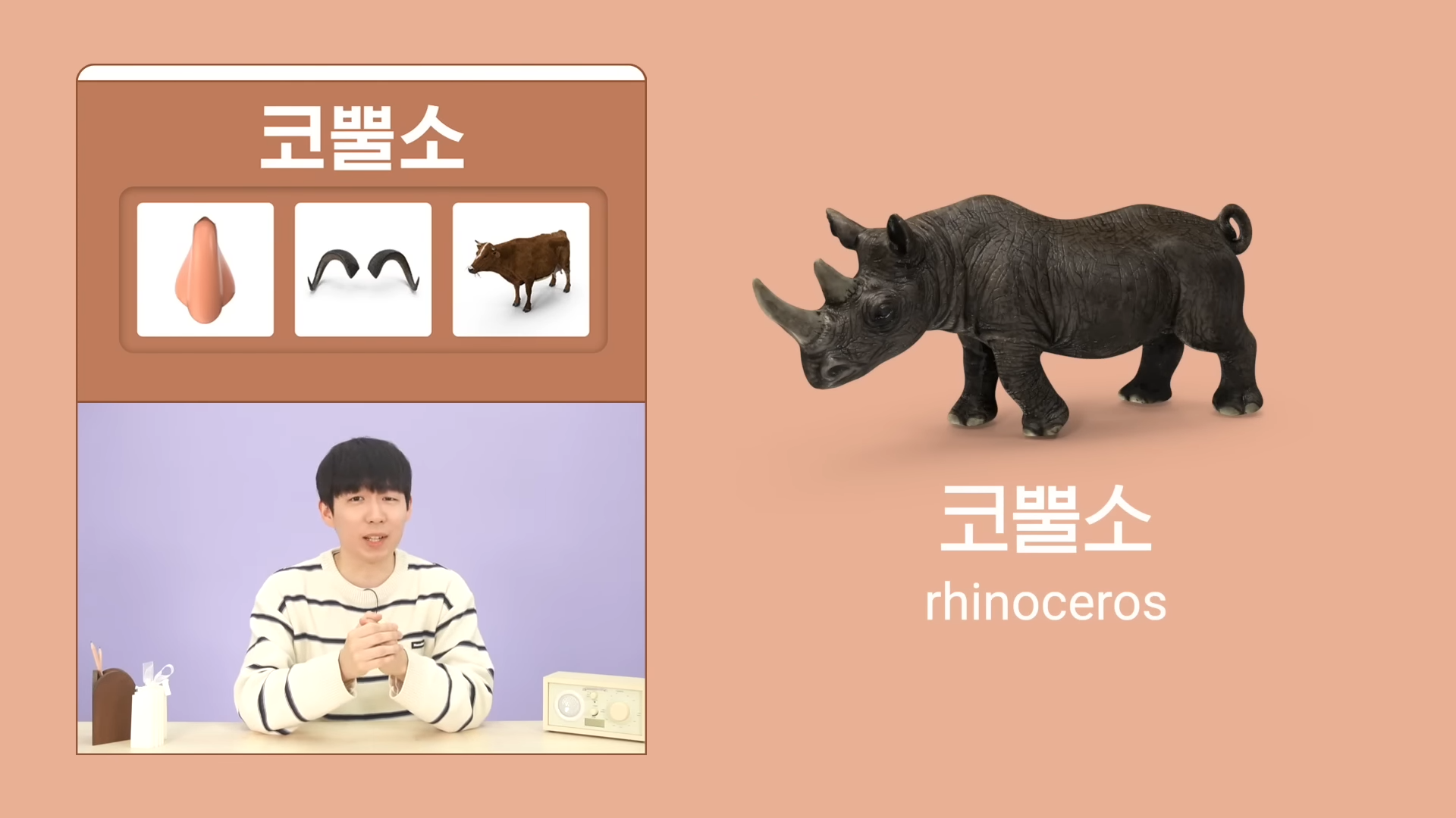 ➡️ When dissecting "코뿔소," it surprisingly means "nose, horn, cow." Can you guess? Yes, it's "Rhinoceros" in Korean! The directness of this translation is quite fascinating.