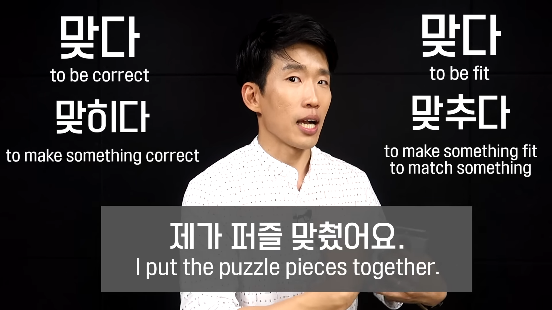 a. When using 맞히다, the meaning of this word is “to be fit”. When used in context, it can be applied to circumstances like trying on new clothes that fit well on you, or clothes that suit you well. This word is versatile and can also be used in other situations. For example, if you’re completing a puzzle and one of the pieces fits perfectly in place, then in this context, you would use 맞히다.