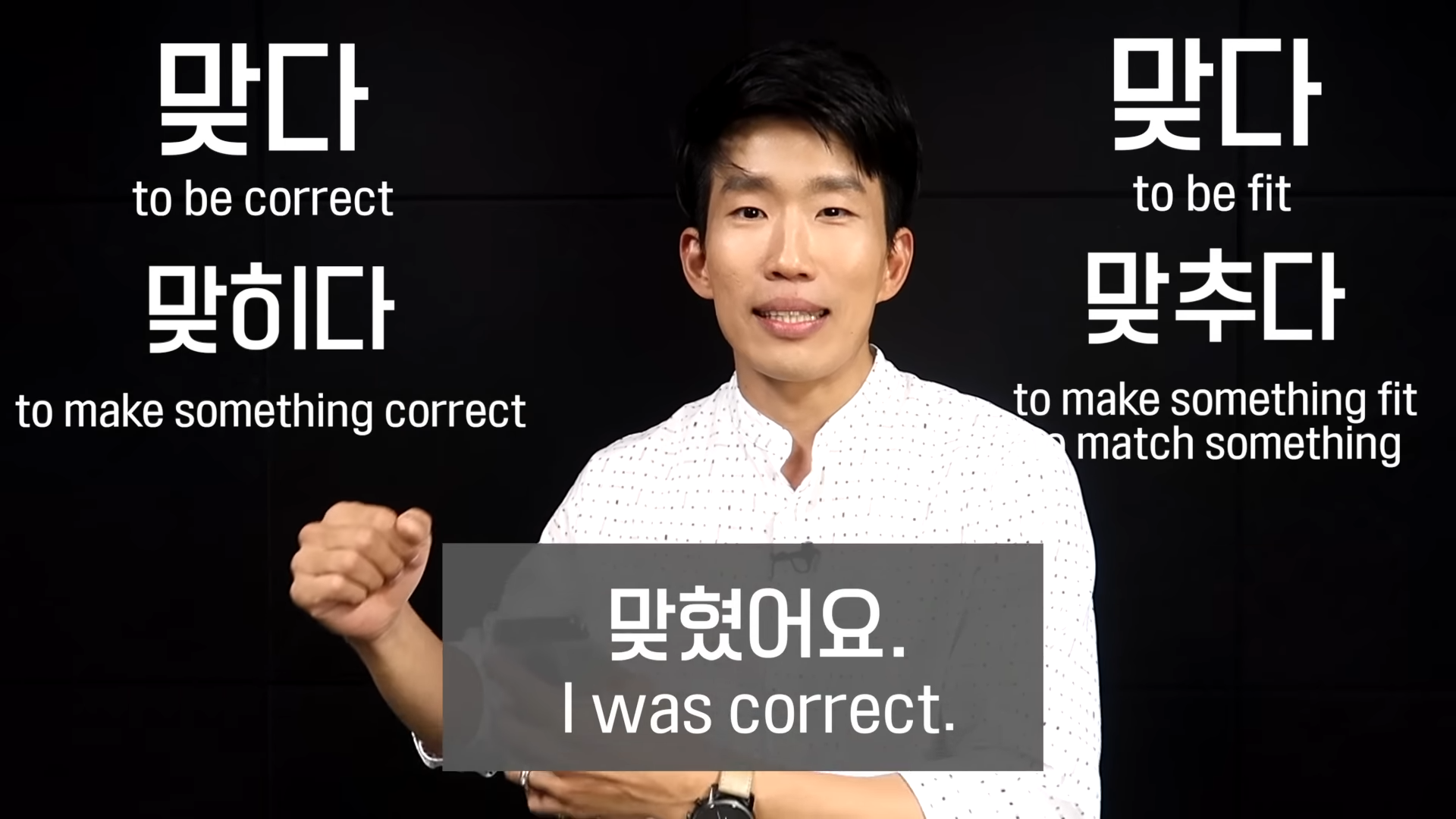 b. On the other hand, 맞추다 is used in a different context. Again, while both refer to 맞다 and sound similar, they do not mean the same and should be used for their respective contexts. For 맞추다, this word means “to be correct” and should be used as such. For example, if you answered a question correctly or accomplished something in the right manner, then 맞추다 would be used.