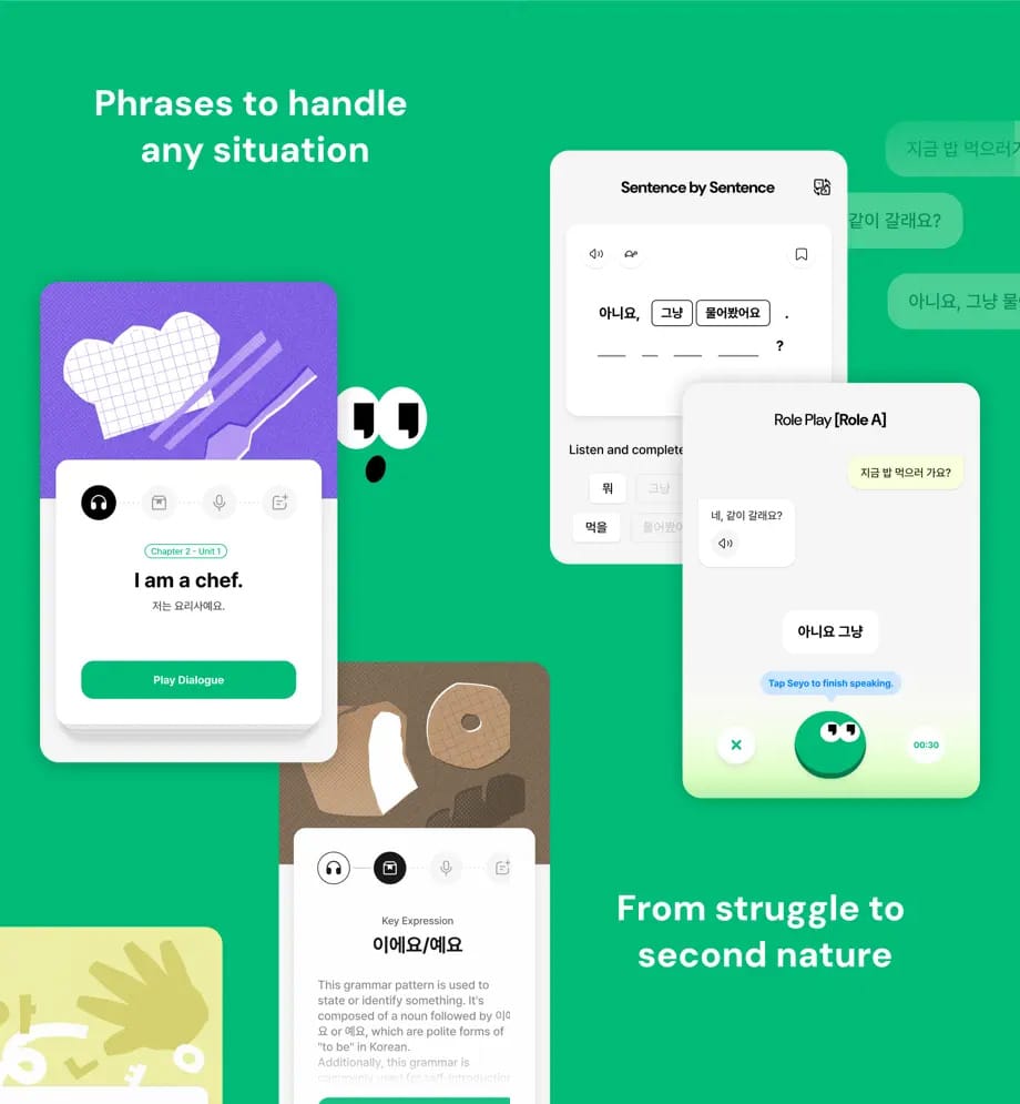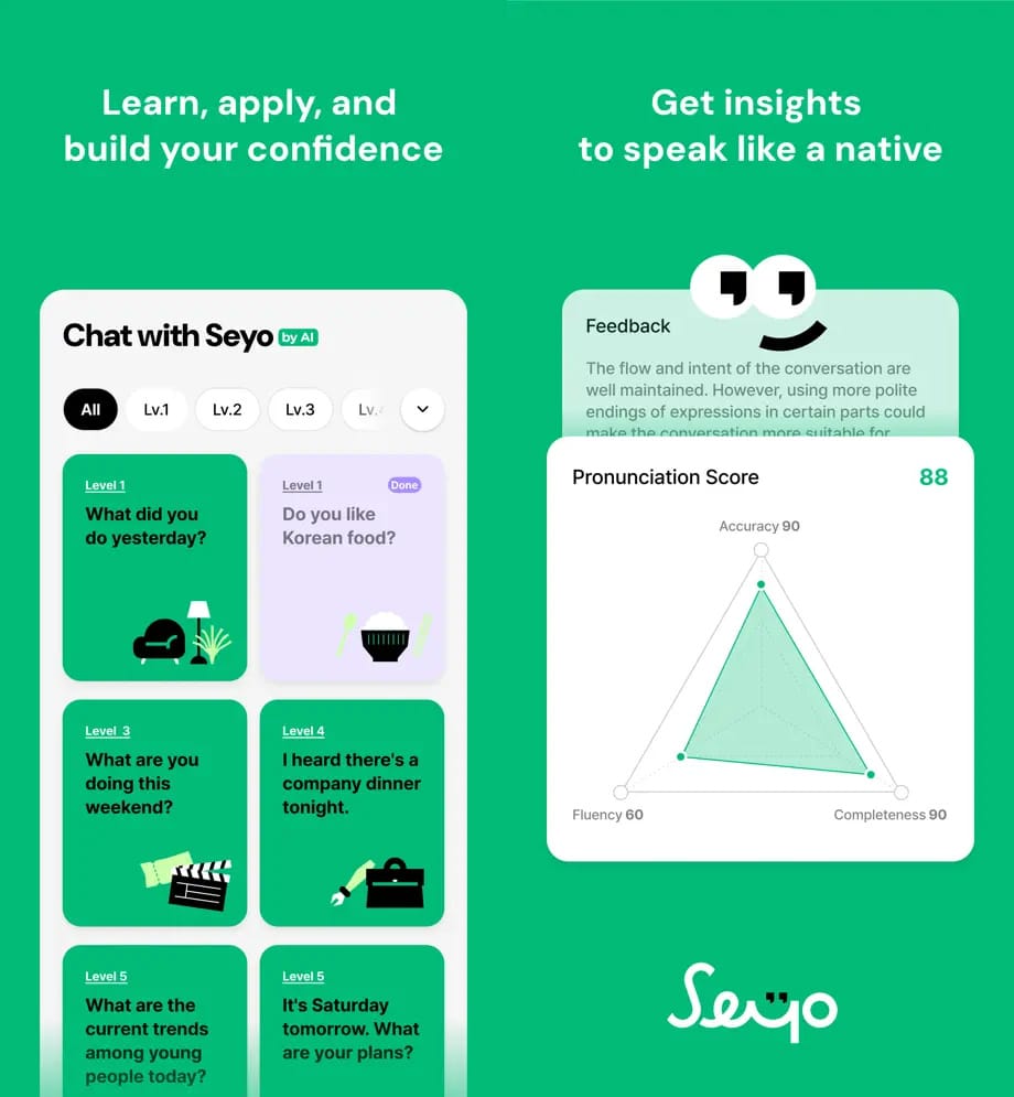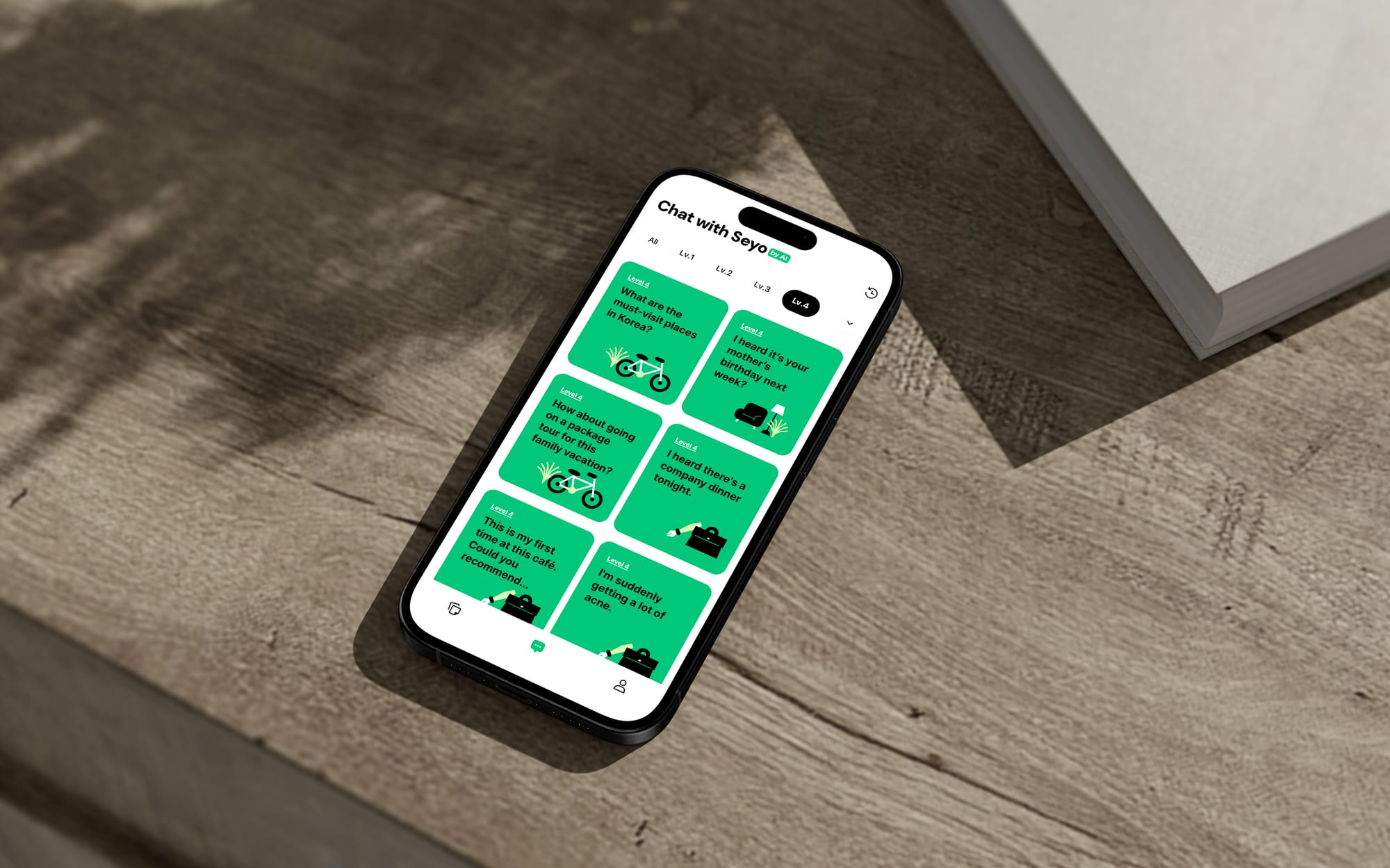 Whether you're just starting out or already speak some Korean, Seyo will guide you through interactive lessons and conversation practice to help you level up your Korean speaking skills faster.