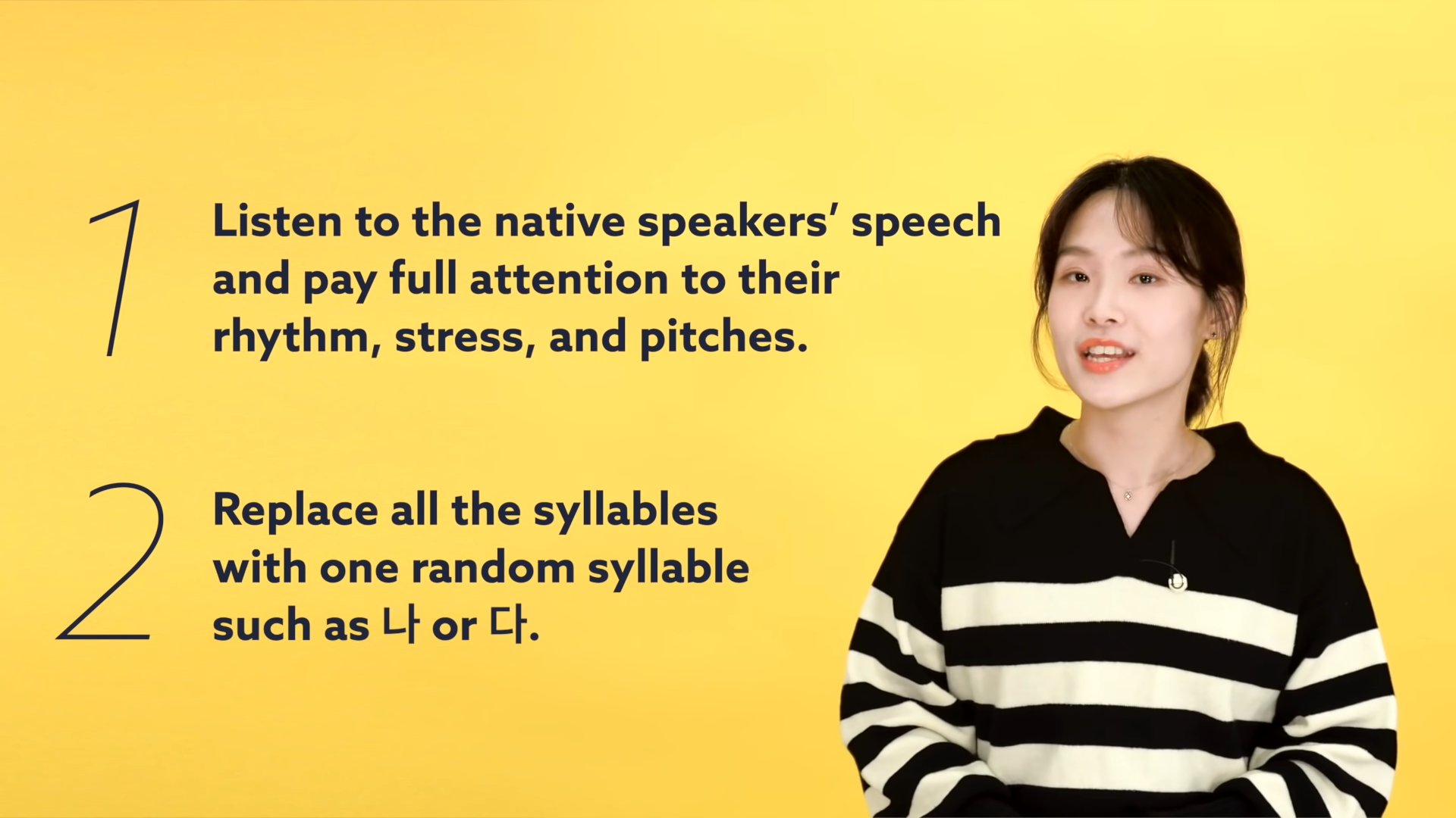 When you try to do everything at once, such as trying to repeat the full sentence in Korean, you lose sight of what exactly you’re practicing. Taking one approach at a time when practicing will help your pronunciation and lead you to fluency once you put it all together.