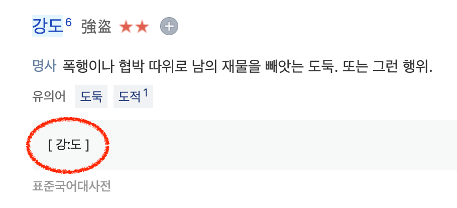 - [강도] intensity, strength / [강:도] robber