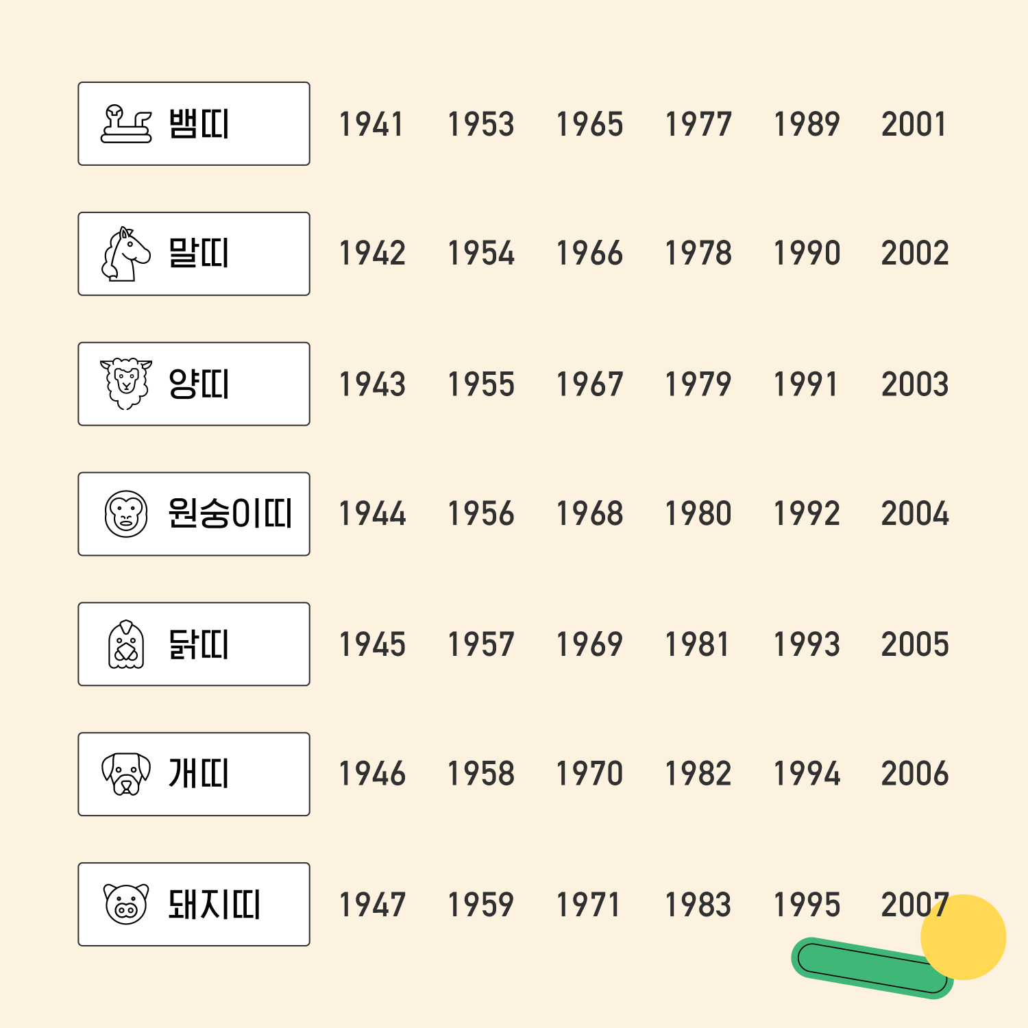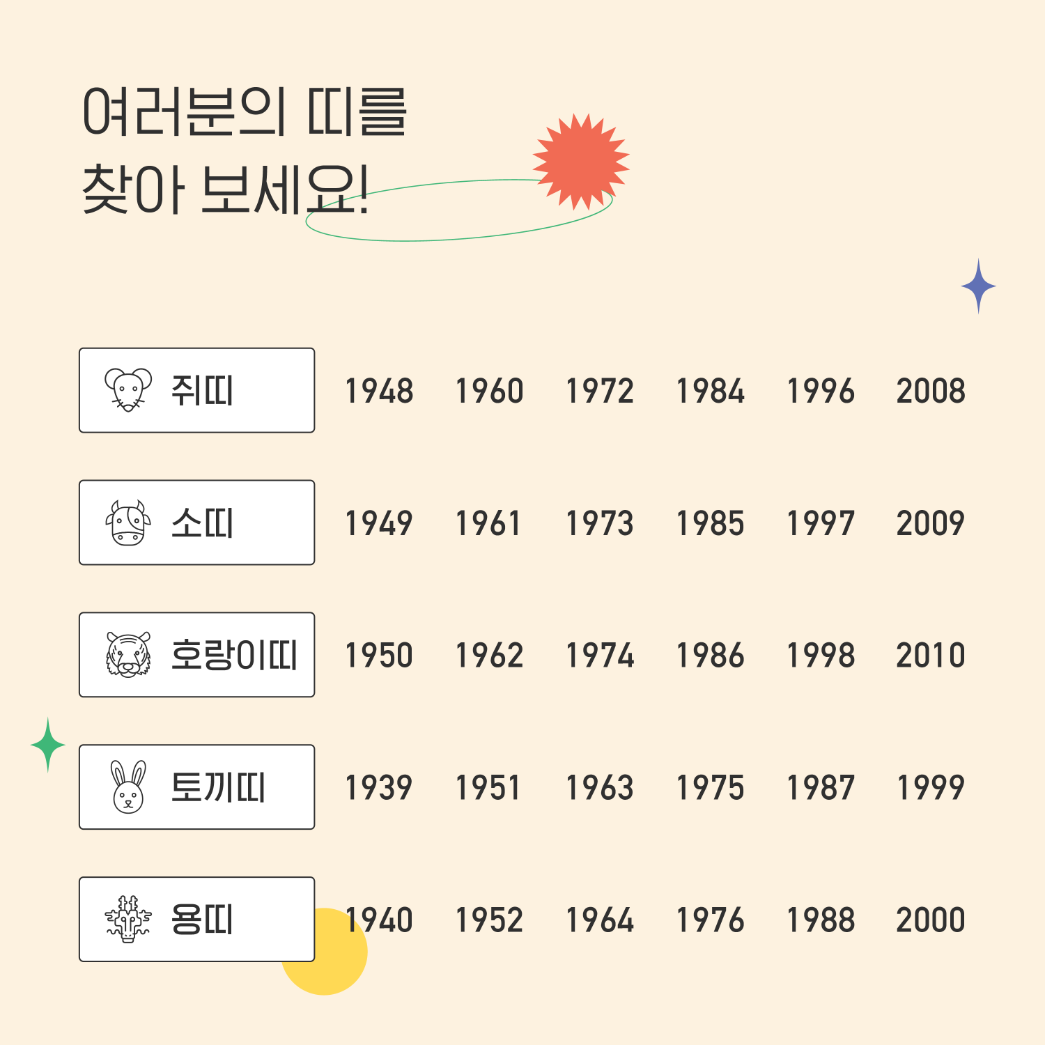 The suffix ‘띠’ refers to zodiac type and is paired with an animal to create a full ‘Year of the ____’ phrase.