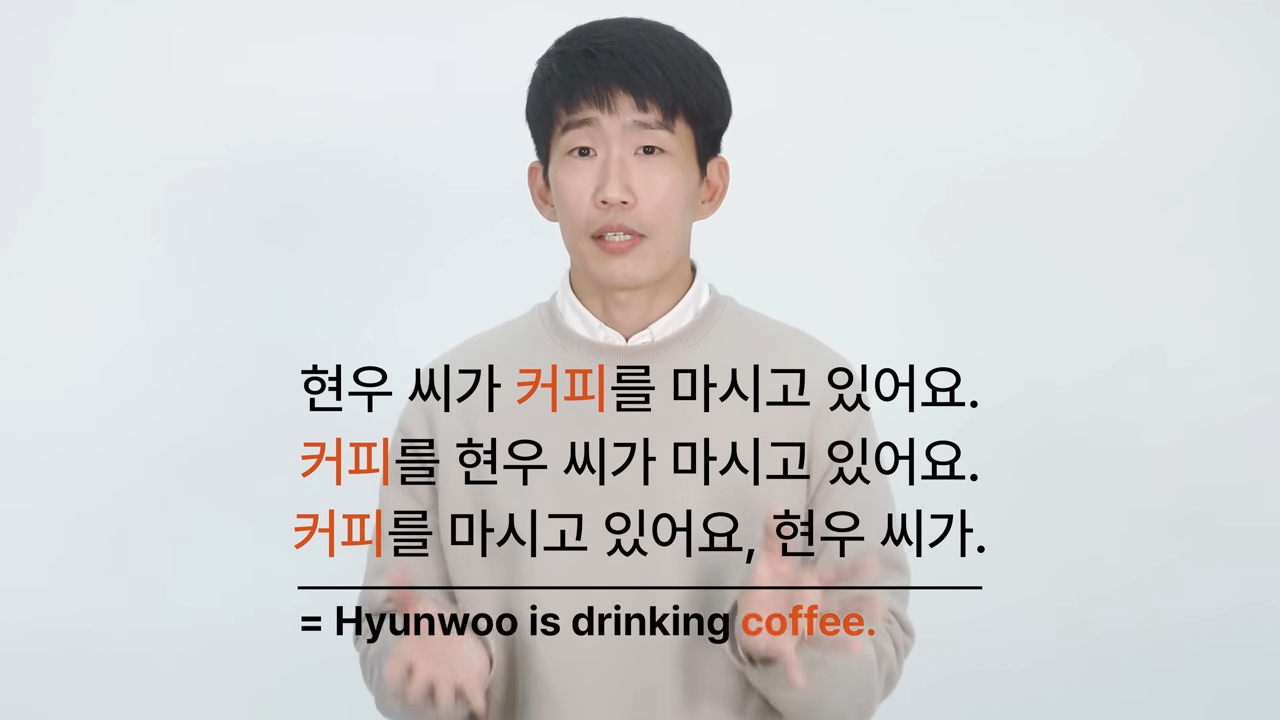 In English, “Hyunwoo is drinking coffee” has to be in that exact order. In Korean, however, you have more flexibility — as long as you preserve the essential components (subject, object, verb at the end, etc.).