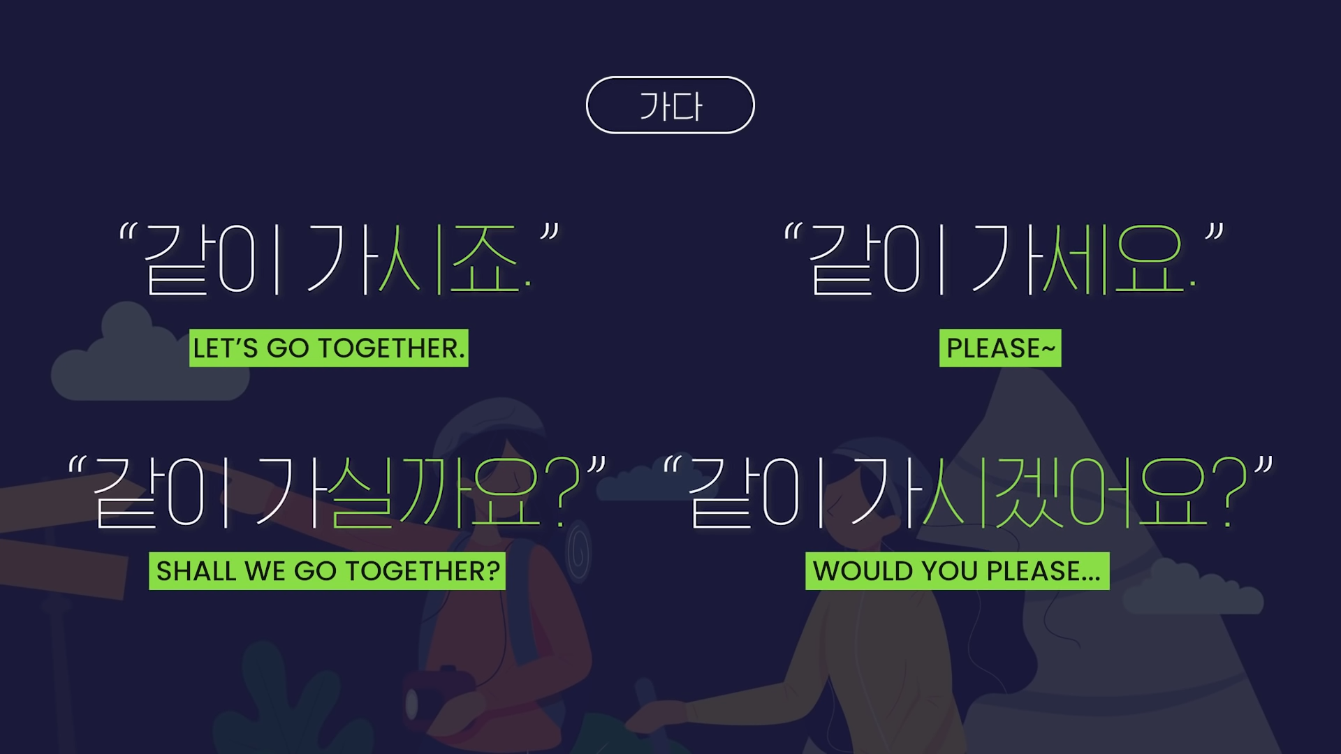 For example, if you were hiking with your teacher and wanted to say “Let’s go,” you would transform the verb 가다 with this ending, creating 가시죠 (kashijyo), which politely urges “Let’s go” and would be appropriate to use toward your teacher or someone of higher position.